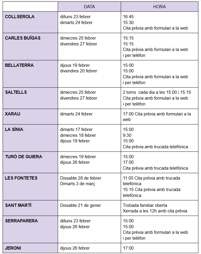 Aquesta informació pot estar subjecta a modificacions. Es recomana consultar directament amb cada centre per confirmar horaris i possibles canvis.