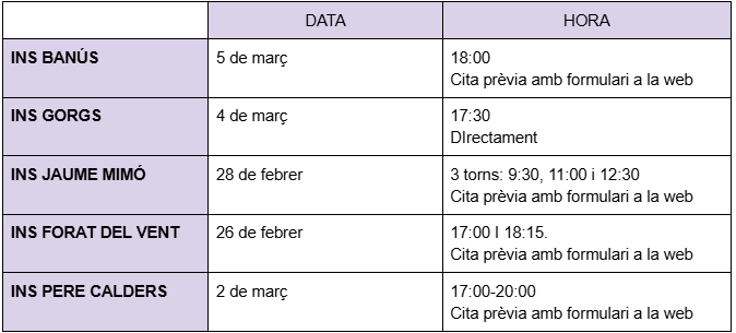 Els centres educatius han confirmat les següents dates de portes obertes.