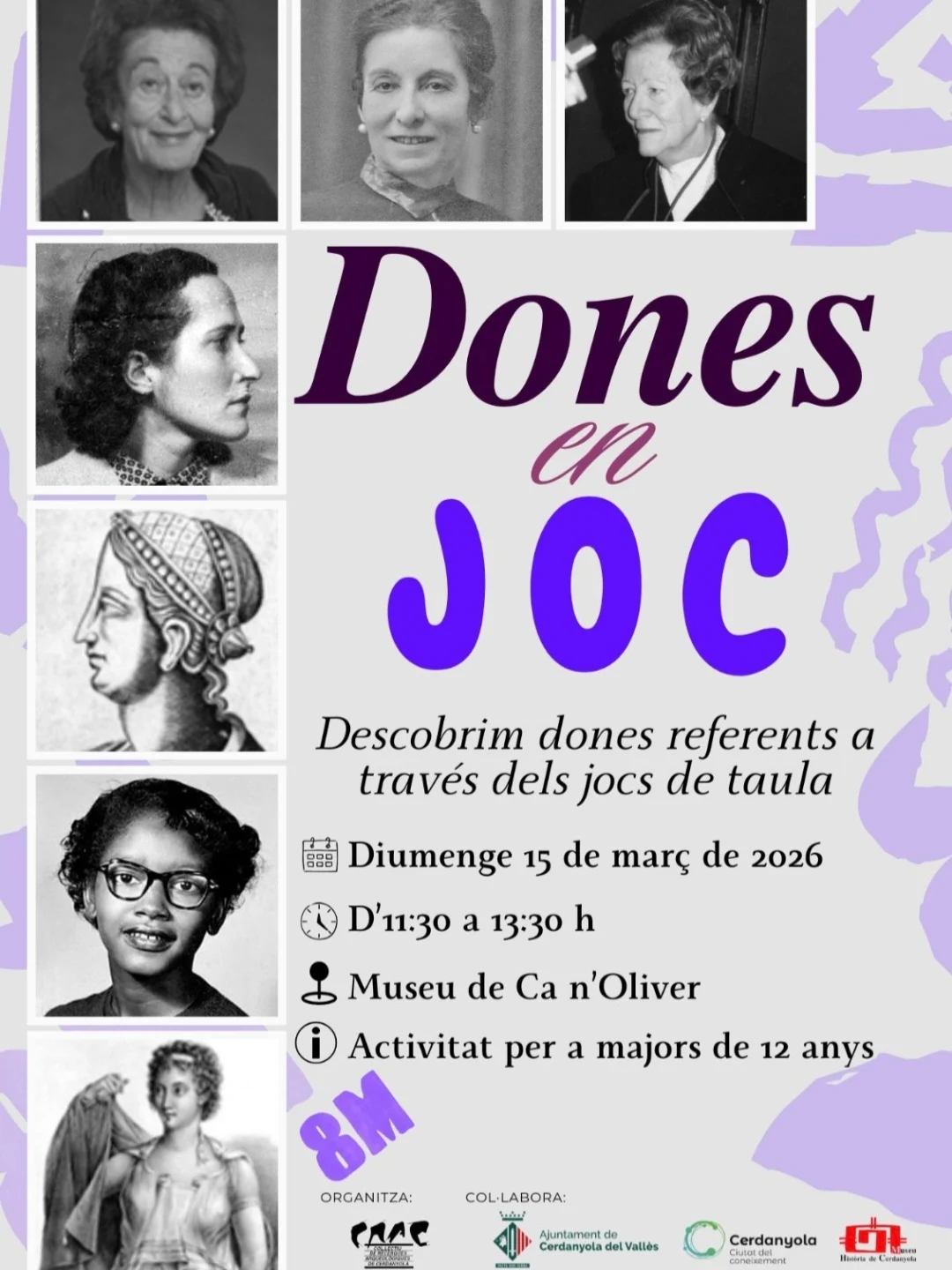 El CRAC i el Museu d’Història us convidem a descobrir la trajectòria d’algunes dones excepcionals de tots els temps i de destacades activistes dels segles XIX i XX des d’una mirada diferent i actual. A través de dos jocs creats especialment per a l’ocasió, us proposem una experiència lúdica i col·lectiva que posa en valor dones que, massa sovint, han quedat en un segon pla. Cada partida esdevindrà una oportunitat per aprendre, reflexionar i compartir, tot fomentant la conversa, la curiositat i el respecte per la diversitat d’experiències viscudes. Aquesta proposta vol ser una manera dinàmica i engrescadora de reivindicar protagonistes femenines, descobrir històries inspiradores i connectar amb el passat des d’una perspectiva contemporània. Un espai obert on tothom podrà trobar el seu lloc per gaudir i aprendre plegats.