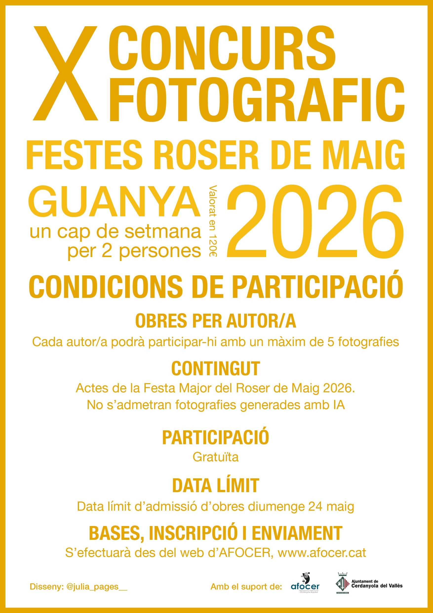 De l'1 al 4 de maig de 2026, a Cerdanyola del Vallès, durant els actes de la Festa Major Es poden presentar fins a 5 fotografies (en color o blanc i negre) Premi únic: Un cap de setmana per a dues persones (valorat en 120 €) La data límit per a participar serà el diumenge 24 de maig de 2025