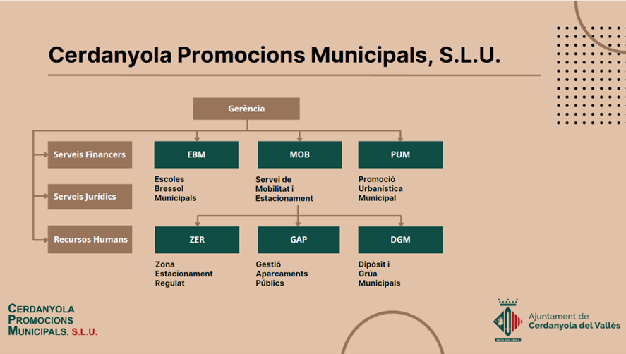 Cerdanyola Promocions Municipals SLU, mitjà propi, és una empresa municipal que va néixer l'any 2008 i pertany a l’Ajuntament de Cerdanyola del Vallès. Gestionem la grua municipal, la zona taronja, els tres aparcaments soterranis públics de Cerdanyola.